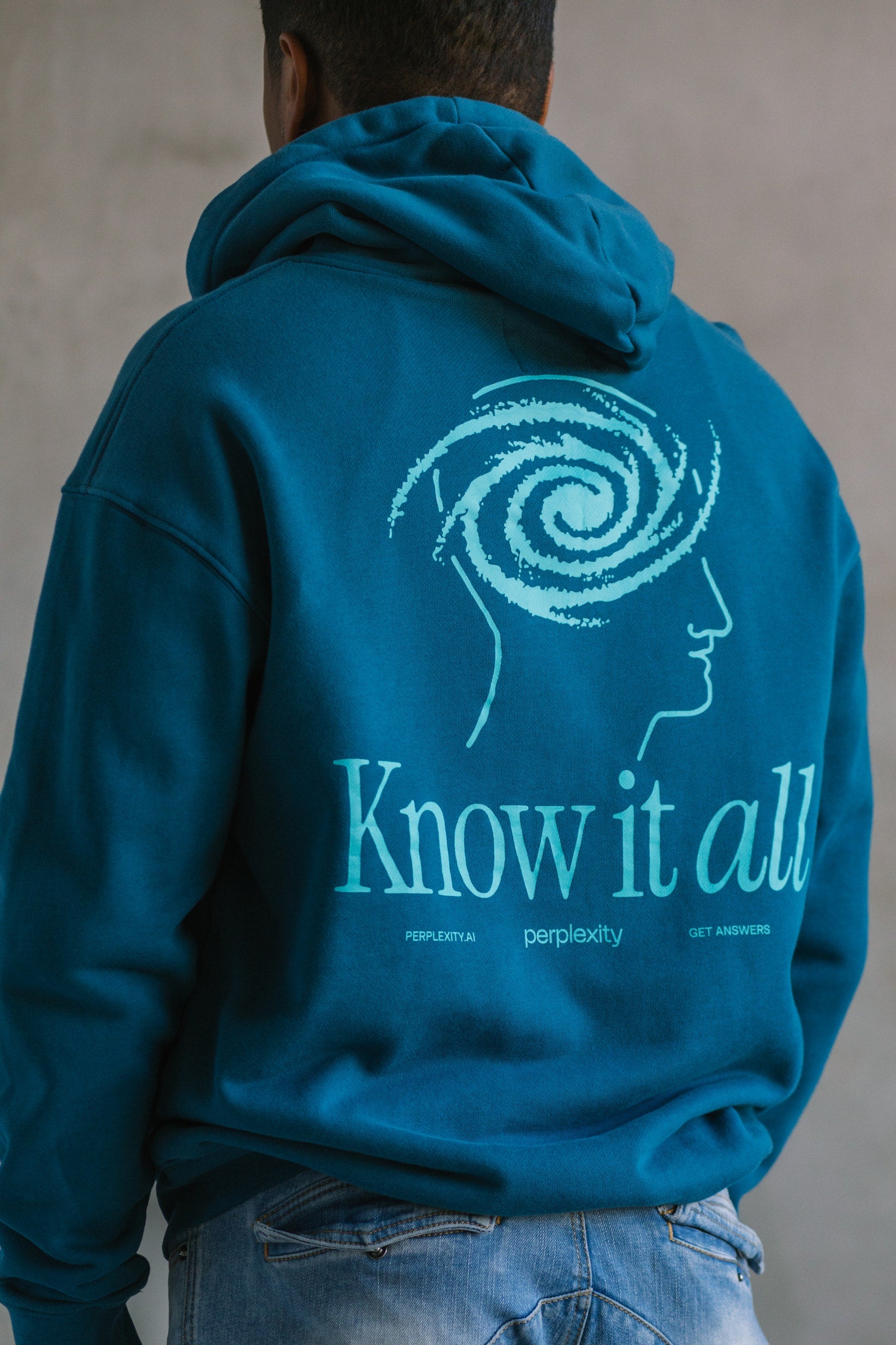 Our signature heavyweight cotton hoodie combines cosmic style with premium comfort. The hoodie features a hand-drawn Perplexity logo embroidery and a playful "Know it all" Galaxy Brain screen print on back. The hoodie serves as a wearable reminder that the answers are always within our reach.